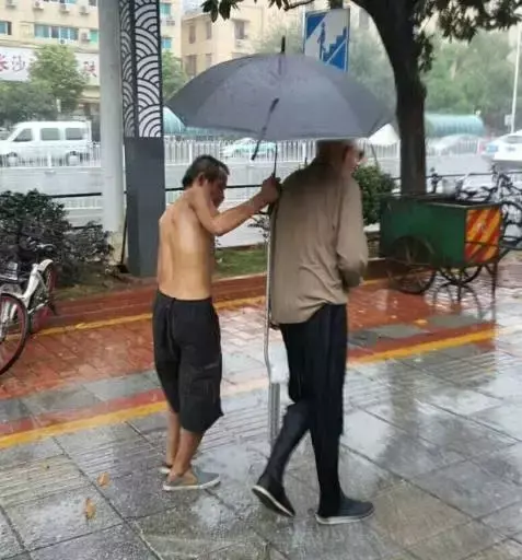 16)10 日长沙暴雨,一流浪汉主动帮行动不便的拄拐老人撑伞。平日里,有人送这位流浪汉东西他都谢绝,因为不会说话,他就竖着大拇指笑。