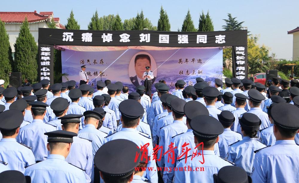 8)昨日上午,渭南市公安局巡特警支队因公殉职民警刘国强追悼会在渭南殡仪馆隆重举行。刘国强生前的同事、战友以及闻讯赶来的群众为他送行。 (点击文字 渭南巡特警刘国强殉职 警民含泪送忠魂)