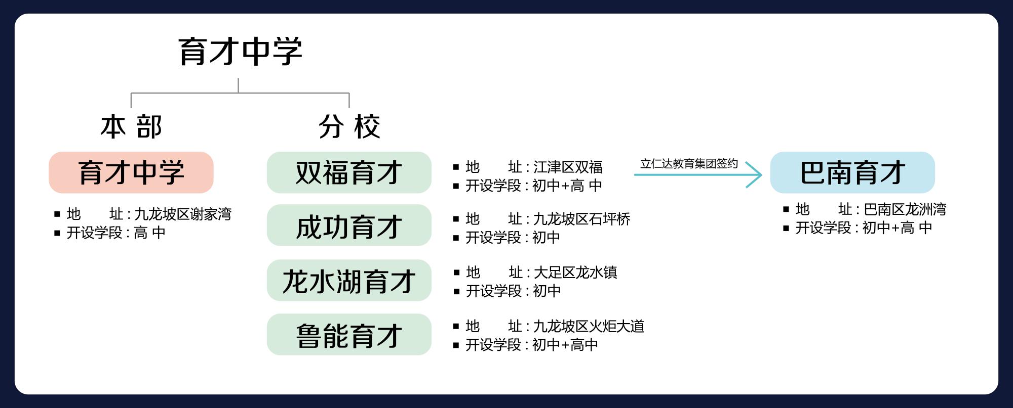 巴南育才中学是立仁达教育管理公司旗下的,与双福育才有签订合作协议,双福育才属于育才中学本部(袁家岗校区)的分校。
