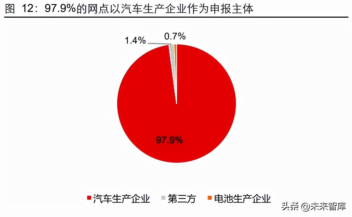 国家政策明确汽车生产企业作为回收责任主体。2019 年 11 月工信部发布《新能源汽车 动力蓄电池回收服务网点建设和运营指南》,提出新能源汽车生产及梯次利用等企业应 按照国家有关管理要求通过自建、共建、授权等方式建立回收服务网点,新能源汽车生 产、动力蓄电池生产、报废机动车回收拆解、综合利用等企业可合作共用回收服务网点。 目前在工信部公布的新能源汽车动力蓄电池回收服务网点信息中,从申报主体来看,汽 车生产企业申报的网点在 1.4 万个网点中占比达到 97.9%,从网点形式来看,汽车销售 公司和汽车修理中心占比分别为 79.3%、14.7%,汽车生产企业在回收体系中占据优势。