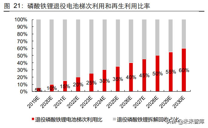 假设:磷酸铁锂退役电池采用先梯次利用,后再生利用的处理顺序。我们假设磷酸铁锂 梯次利用比例从 2019 年的 5%逐步提高到 2030 年的 60%,没进入梯次利用体系的磷 酸铁锂电池假设全部再生利用。假设梯次利用电池退役时残值率为 80%。