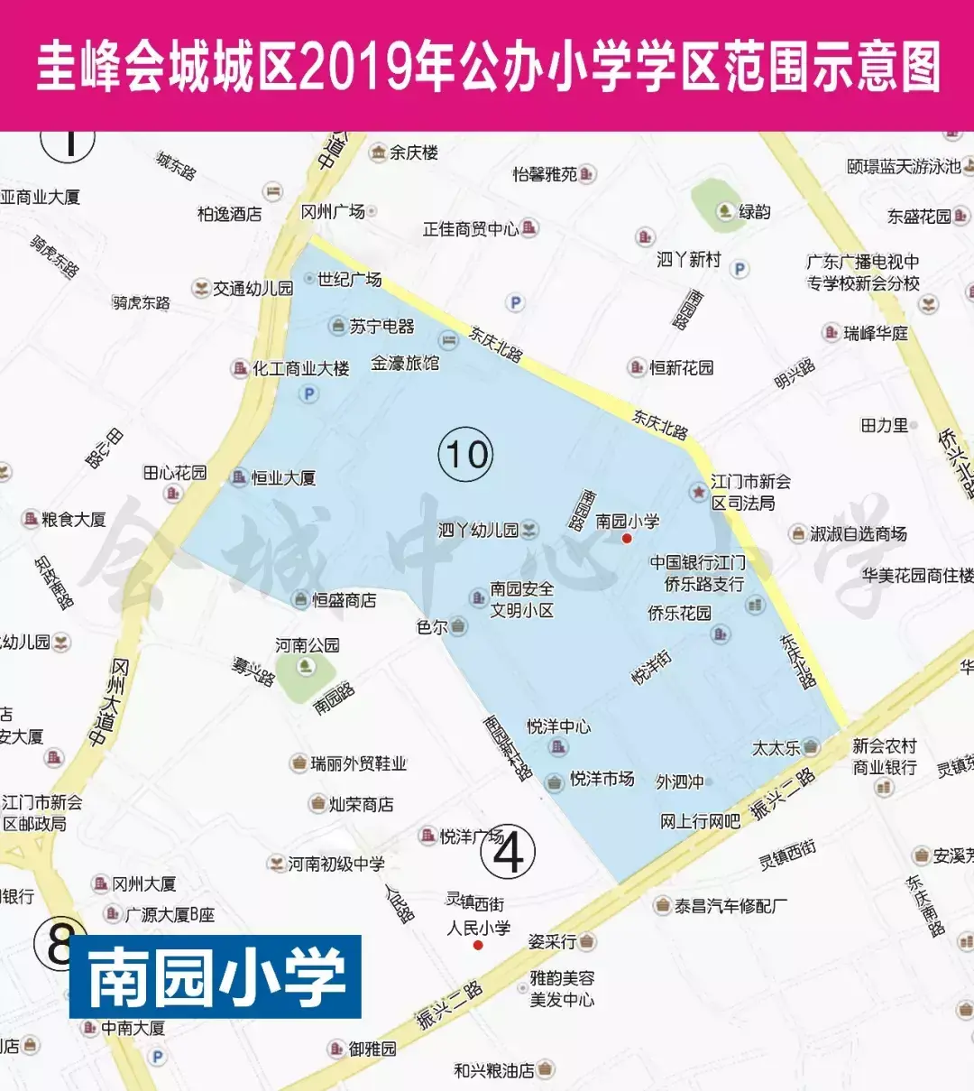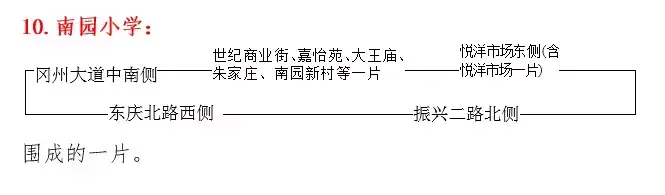 南园小学学区范围调整为:冈州大道中南侧——世纪商业街、嘉怡苑、大王庙、朱家庄、南园新村等一片——悦洋市场东侧(含悦洋市场一片)——东庆北路西侧——振兴二路北侧围成的一片。