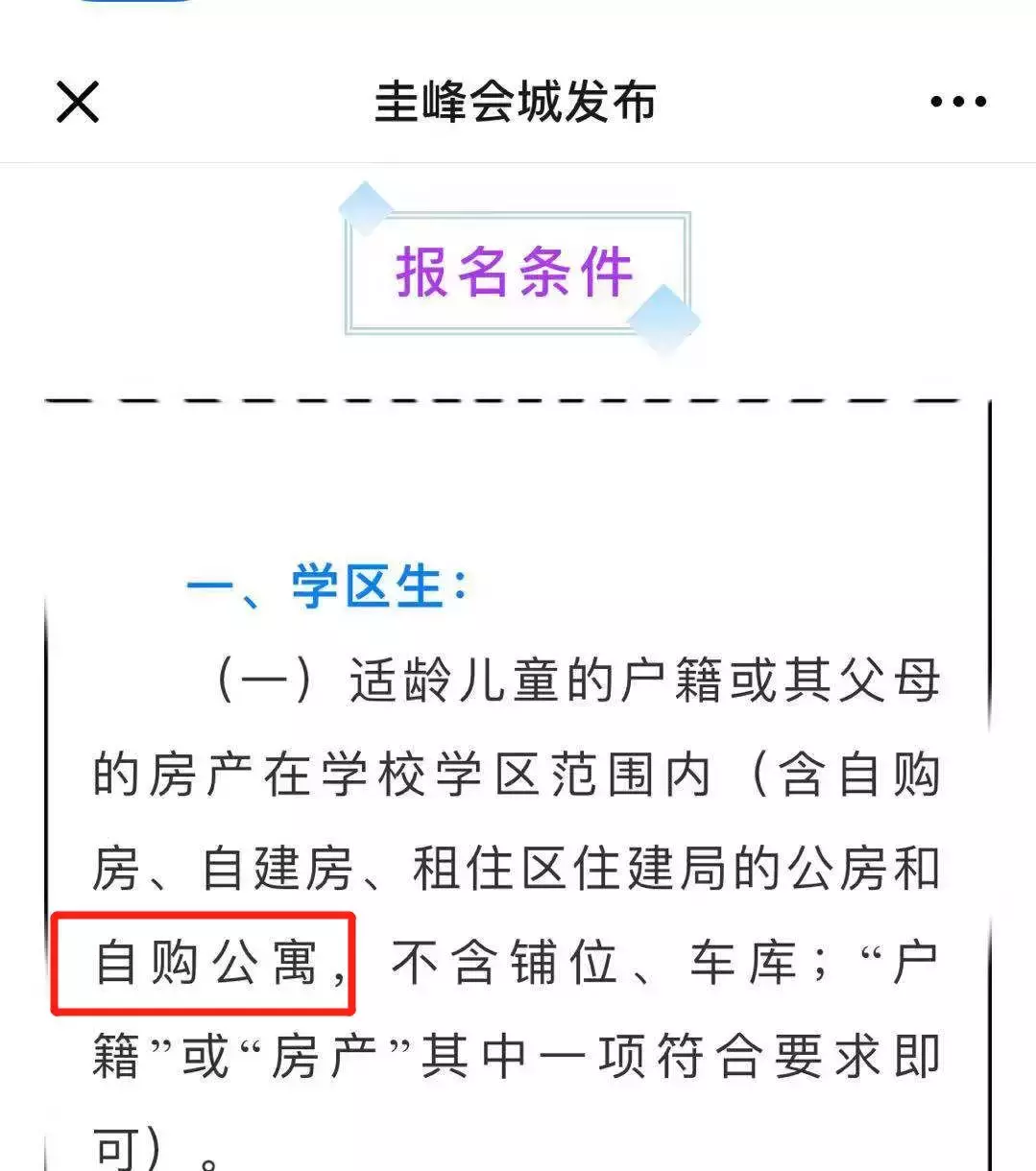 “适龄儿童的户籍或其父母的房产在学校学区范围内(含自购房、自建房、租住区住建局的公房和自购公寓,不含铺位、车库;“户籍”或“房产”其中一项符合要求即可)。”▲信息来源:圭峰会城发布