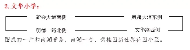 学区范围为:新会大道以南、启超大道以东、明德一路以北、文华路以西围成的一片和南湖壹品、南湖壹号、碧桂园新仕界花园小区。
