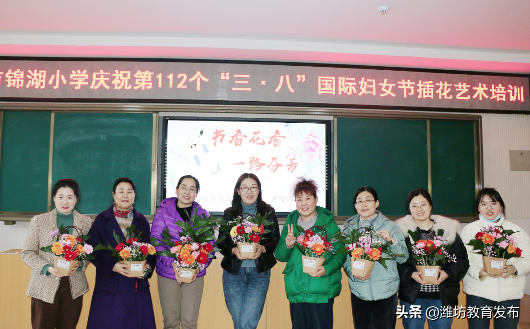 ▲安丘市锦湖小学:举行“书香花香 一路芬芳”庆“三八”国际妇女节插花艺术培训活动。