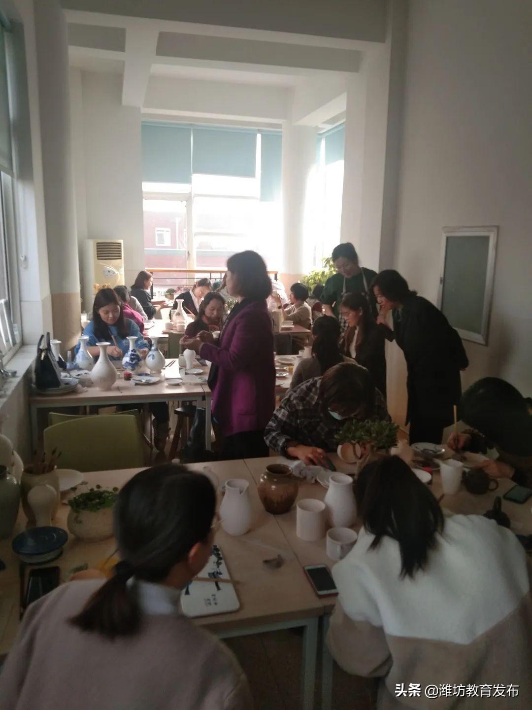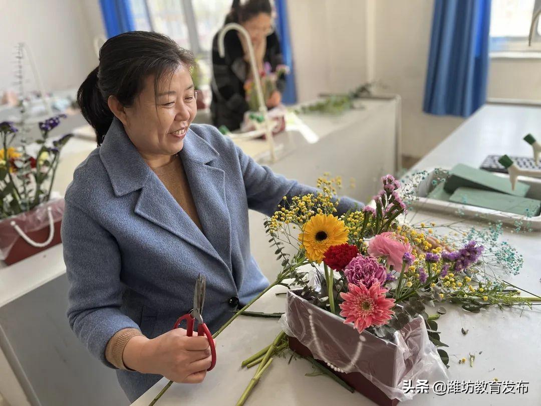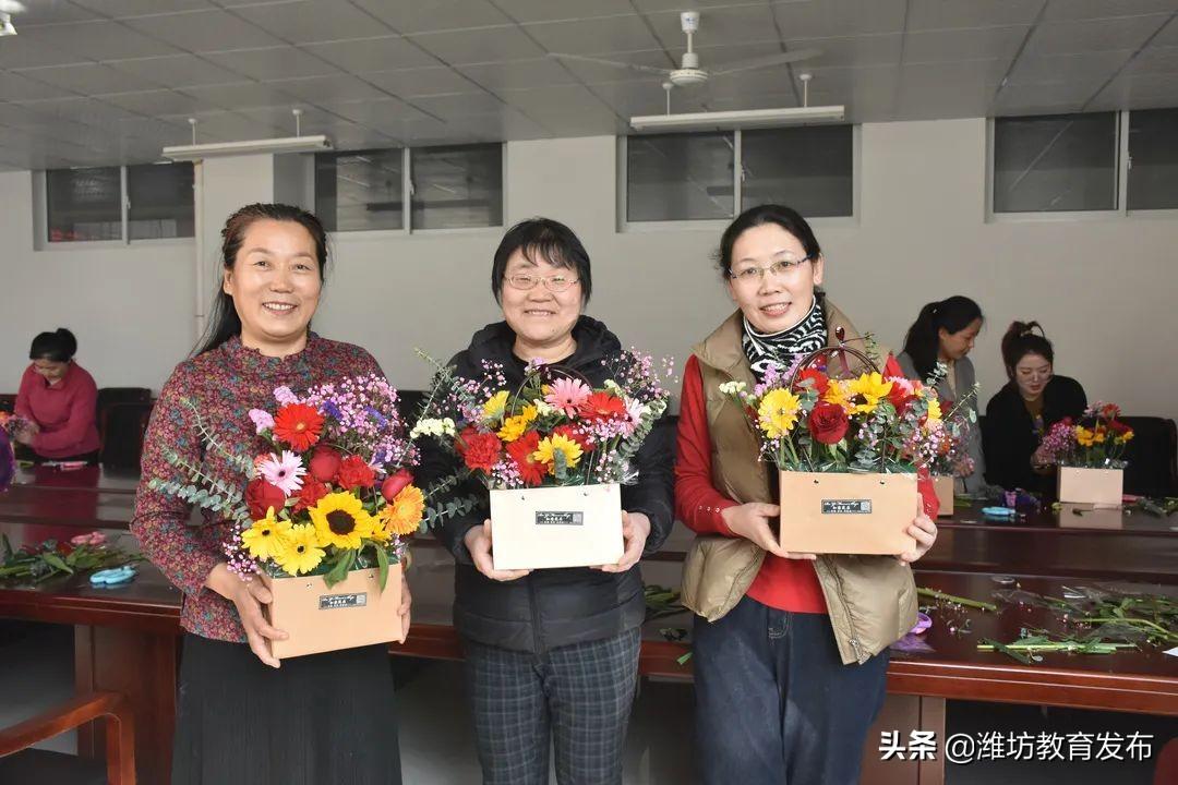 ▲寿光市稻田镇王望初级中学:组织了花艺沙龙,聘请花艺师教女职工现场学习插花。