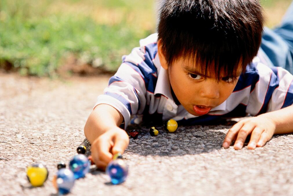 弹玻璃球最常见的玩法是,先在地上挖一个小坑,几个小伙伴轮流弹玻璃球,谁的玻璃球最先进坑,就算赢了。而没进球的人,就得把玻璃球交给赢的那个人。