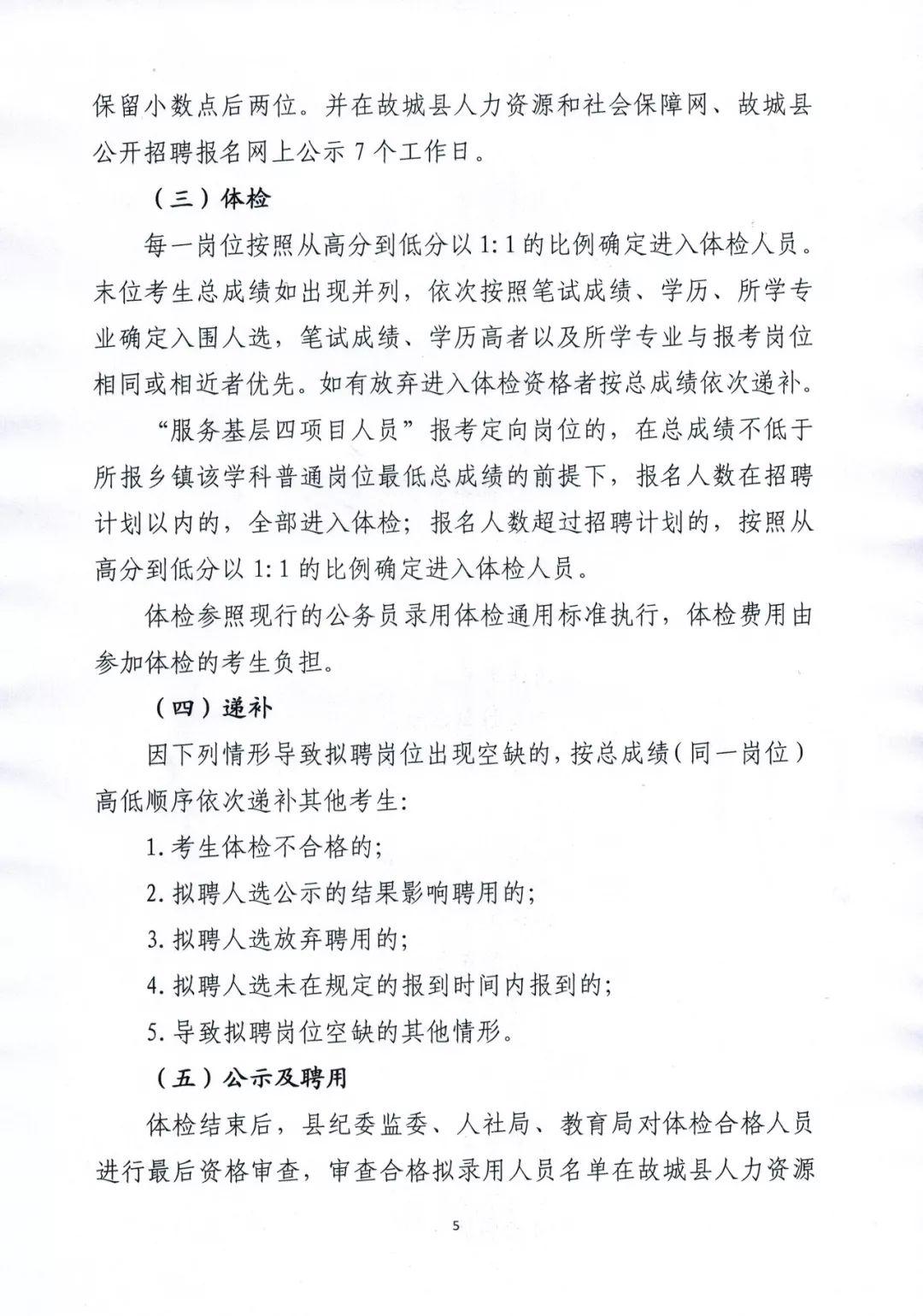 根据考生总成绩,按照招聘计划1:1的比例从高分到低分确定参加体检人选。如考试总成绩相同,按以下顺序确定进入体检、考察人员:笔试成绩较高者,学历(学位)较高者,烈士子女或配偶,具有基层工作经历或基层工作经历较长者。体检工作由县招聘工作领导小组统一组织实施,体检参照现行的《公务员录用体检通用标准》执行。体检费用个人负担。体检合格的,对其思想政治表现,道德品质等情况进行考察。体检、考察不合格的,取消拟聘人选资格。因体检、考察不符合要求导致招聘名额出现空缺的,按照总成绩从高分到低分依次递补其他考生。体检、考察合格的考生确定为拟聘用人员(其中,报考初级中学和小学岗位的人员,按照报考岗位总成绩由高分到低分进行选定聘用单位,聘用单位一旦选定再出现招聘名额空缺情况的不再进行递补)。