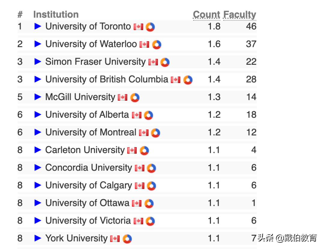 理工科强校多伦多大学和滑铁卢大学分获榜首和次席,约克大学升至加拿大第八也受到极大的认可。