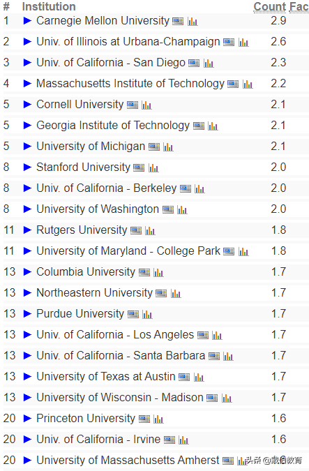 美国大学的计算机综合实力是最强的,因此榜单中的学校更是神仙打架。前40名的学校放在世界上都是数一数二的。