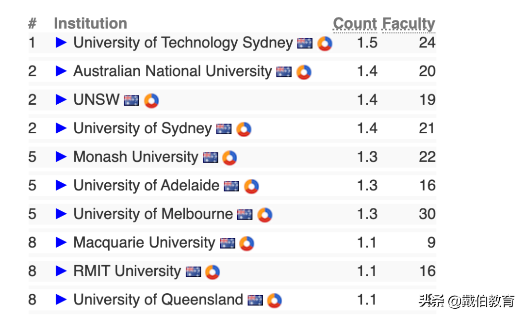 澳洲院校里,悉尼科技大学占据榜首,其它多所院校分别并列第二、第五,以及第八。