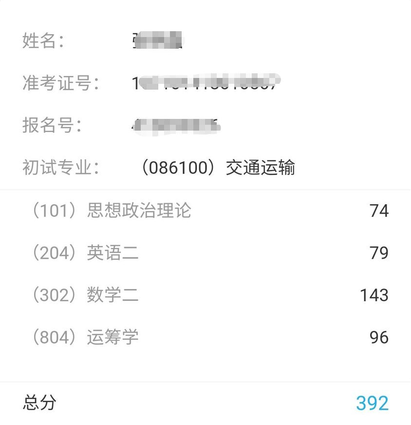 大家好,我的本科院校是华北水利水电大学的交通运输,21考研成功上岸长安大学的交通运输,考研总分392分:政治74、英语79、数学143、专业课96。