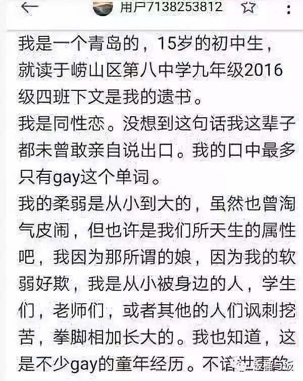 今年5月14日,青岛15岁初三学生在微博发「遗书」。他自称是同性恋,在学校被同学以及老师挖苦、讽刺;在家里,他曾被父亲抓着头狠狠往墙上摔,并承受着家人的不理解和质问,「你是不是有病」、「你是不是变态?」……