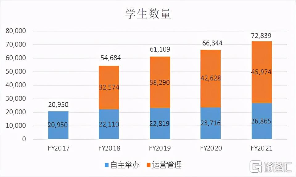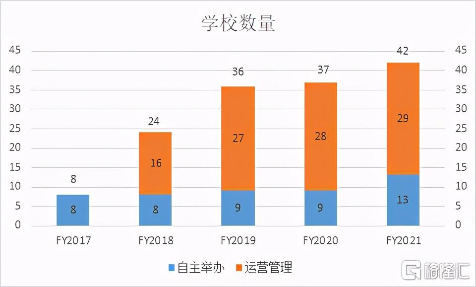 此外,海亮教育还有宁海公学和湘湖公所两所自主举办学校仍在筹建中,预计将于2022财年开始贡献收入。另外,与金华海亮外国语学校类似,仙桃一中、新昌南瑞实验学校、肥城海亮外国语学校的举办权归母公司所有,运营由海亮教育承担,很可能逐步并入海亮教育体内。如按如此的扩张节奏,自主举办学校的学生人数会进一步增长到近5万人,是目前自主举办学校学生人数的近一倍。