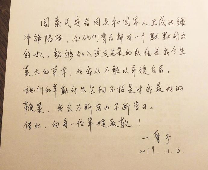 陏后张馨予在微博上发了一篇手写小短文,表示:“能够加入这支光荣的队伍是我的荣幸,但我从不敢以军嫂自居。”