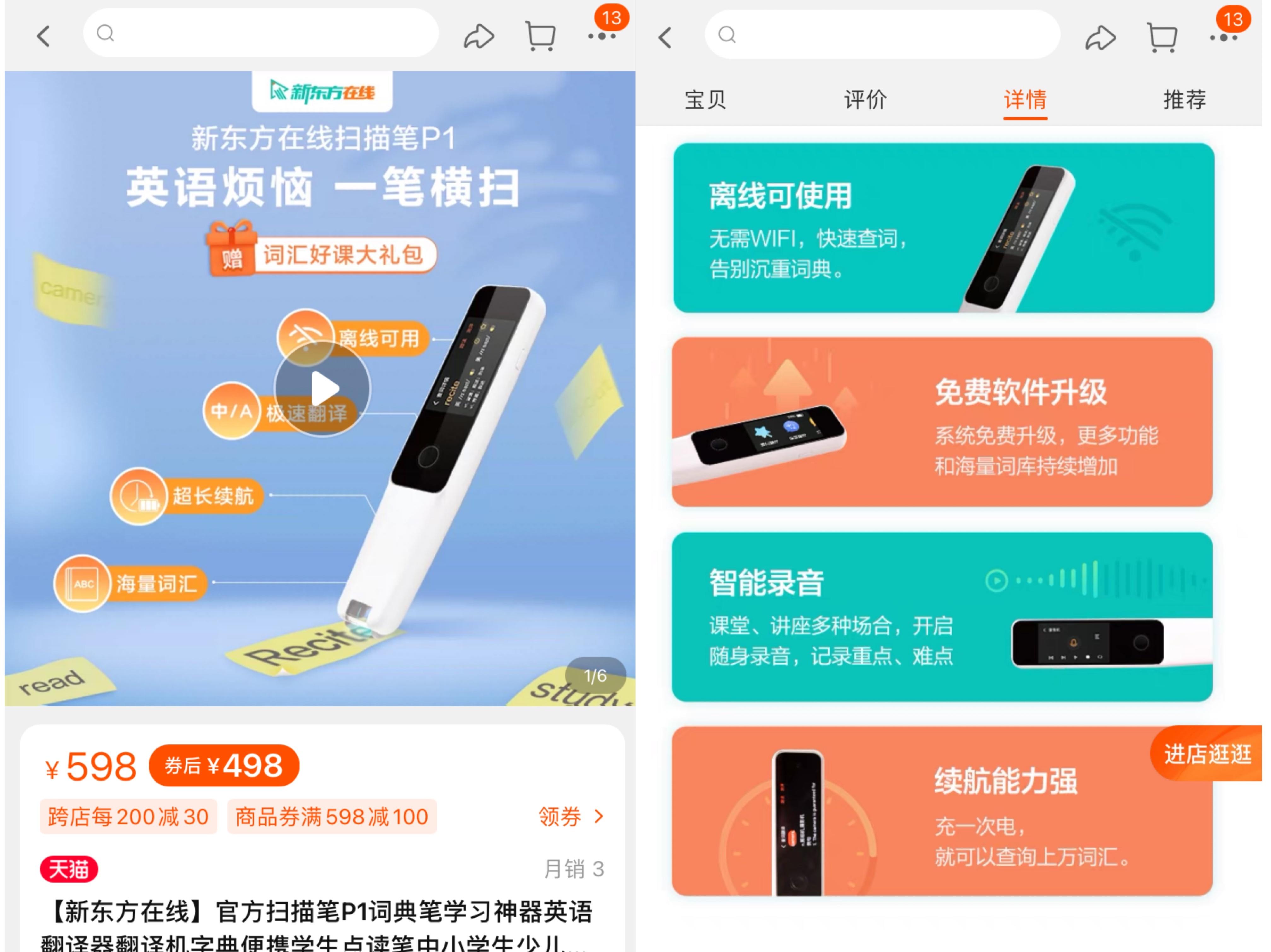 硬件方面,芥末堆注意到,近期,新东方在线上线英语学习智能硬件产品“新东方扫描学习笔P1“,支持扫描翻译、录音,可离线使用。该产品新东方在线教育旗舰店售价为598元,券后498元,官网价格也为498元。
