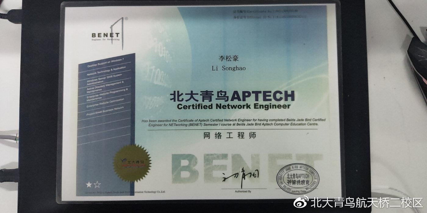 主修课程:Linux企业级应用、H3C与VPN、SQL Server数据库管理、大型网络部署运维、图像处理与网页设计、Win服务器系统管理、信息安全技术与应用