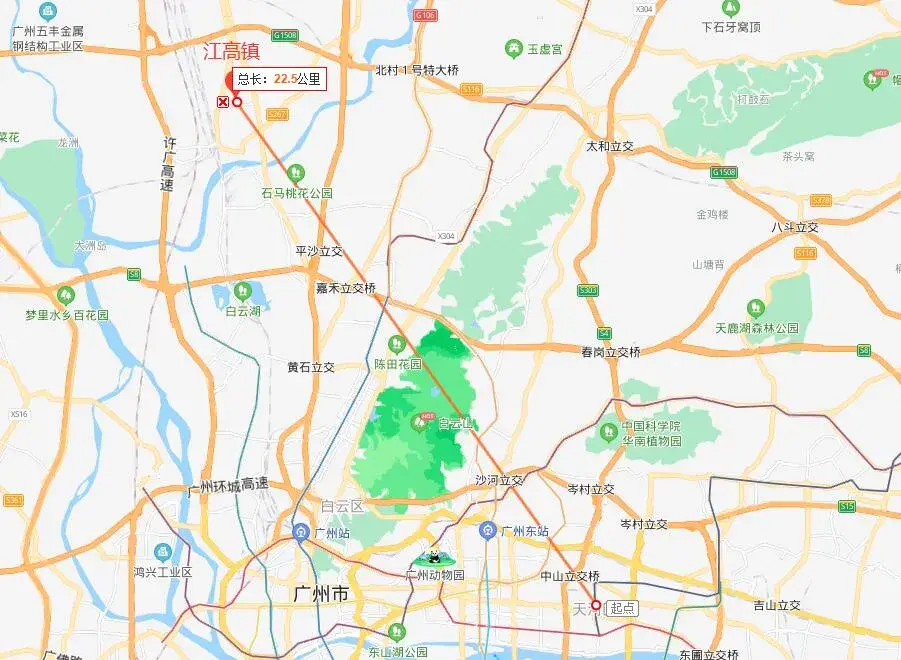 据百度地图,江高镇和天河市区直线距离约23公里左右,未通地铁,目前只能自驾或公交出行。