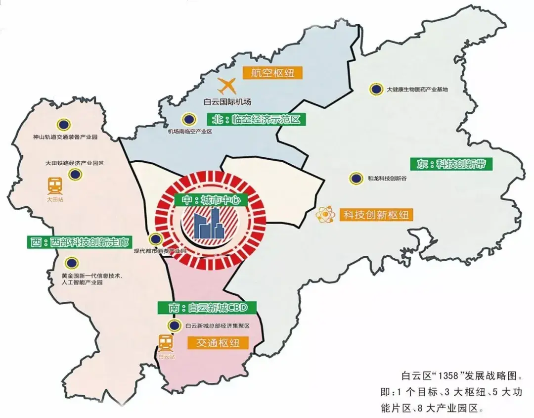 按照白云区“1358”的发展战略规划,江高板块定位白云区西部科技走廊,人和板块则是主打临空经济示范区。钟落潭为大健康生物医药产业基地,主导生物技术与制药、高性能医疗器械、智能健康管理系统及设备等产业。