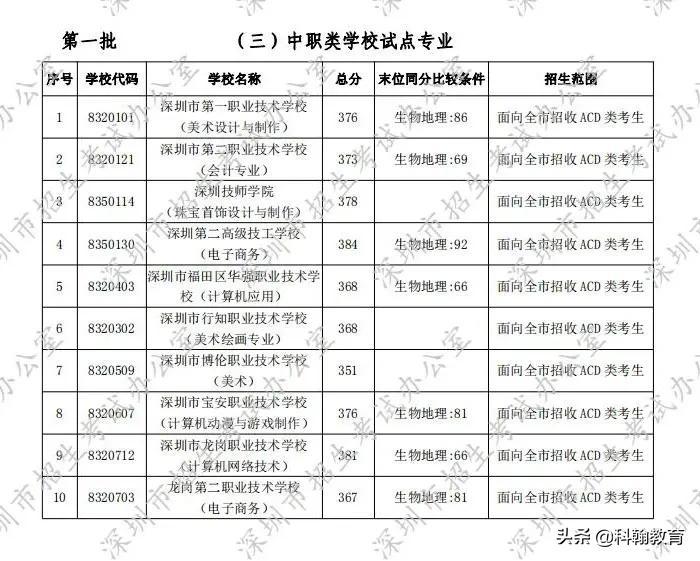 从表中可以看到,深圳一职、二职、技师学院等学校的部分专业,作为了试点专业,放在中考第一批录取。