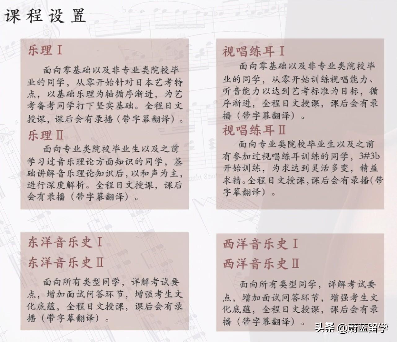 学生上完线下课程还可以拿到课程录像,方便查漏补缺、温故知新。跟蔚蓝留学老师看一下爱德日本语音乐塾的课程设置;