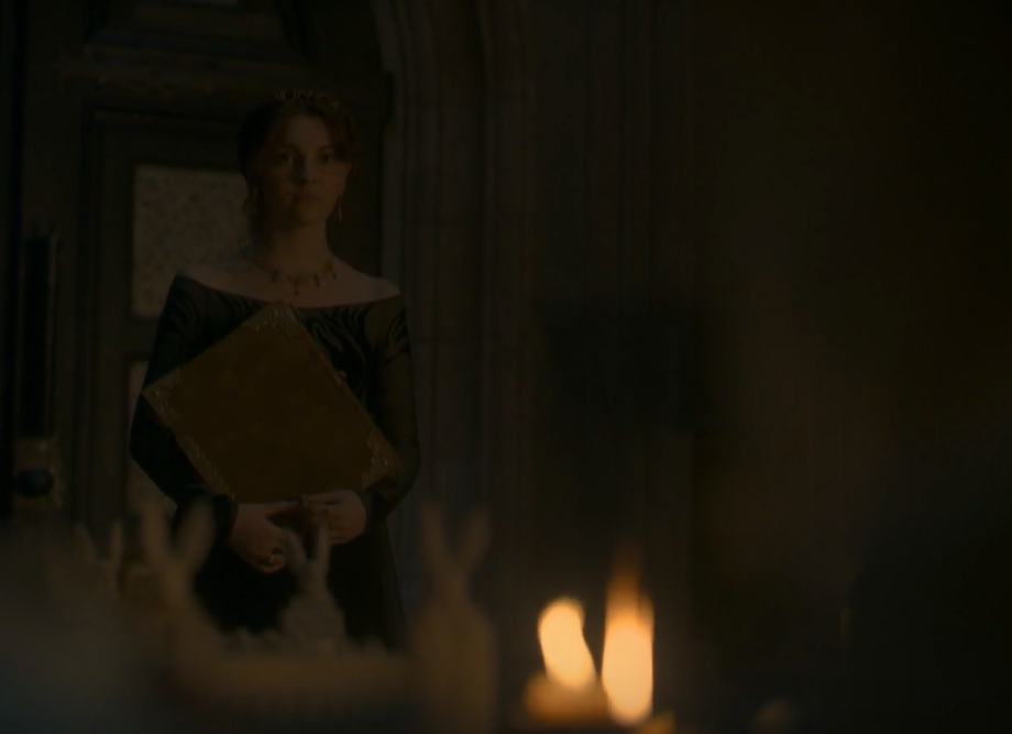 在孙女的婚礼前,荆棘女王走向珊莎,安慰她。