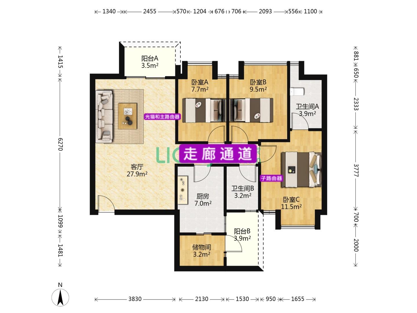 如图所示,我们宽带的光猫和主路由器(小米AX3600)放在了客厅,处于阳台和入户门之间;而小雷居住在卧室C,和路由器之间隔了好几道墙,WiFi信号衰减已经非常厉害。