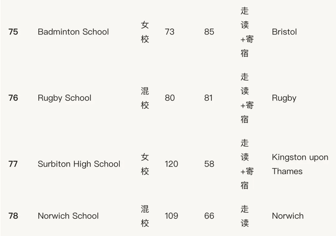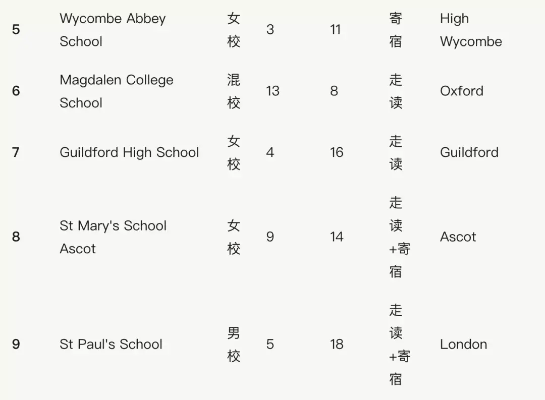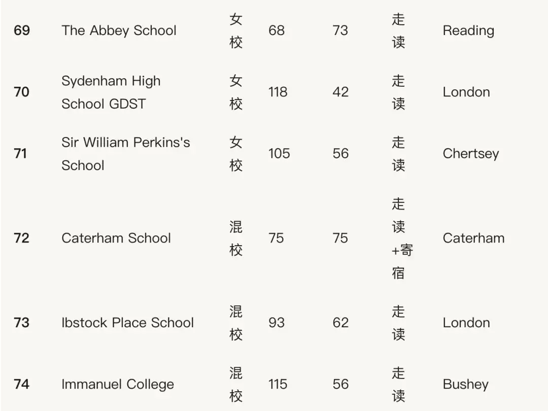《泰晤士报》排名属于《星期天泰晤士报学校指南》的一部分,该学校指南统计了包括公立学校在内的2000多所英国中小学的最新考试成绩。私立中学排名综合分析GCSE和A Level两项成绩,把初中和高中当作一个整体去考量。
