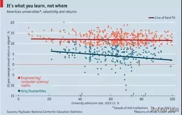 《The Economist》也做过一个关于美国大学选择与回报的调查研究,大数据表明:从未来的收入水平看,“学什么专业” 比 “在哪所学校学习” 更重要。工科、计算机、数学等相关专业,好学校和相对较差学校出来的学生,他们的平均投资回报率,基本平行在一条线上。