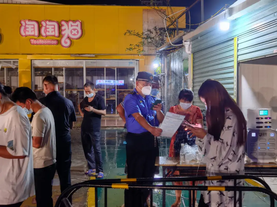 灌口派出所民警们维持秩序的同时,同社区工作人员一道耐心地为居民解答问题,还为排队居民送上降暑物资。