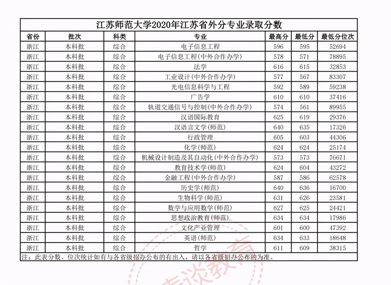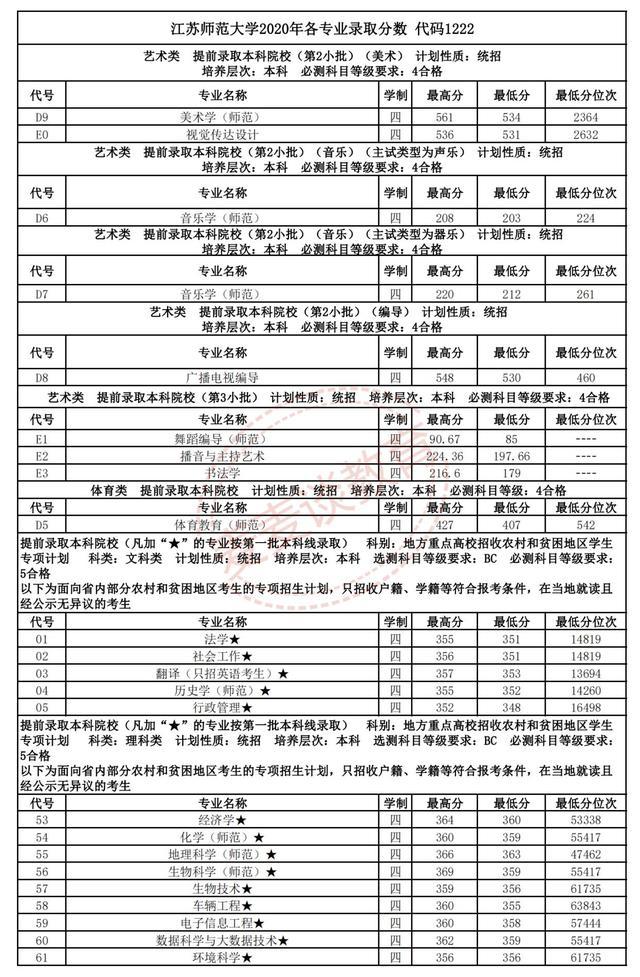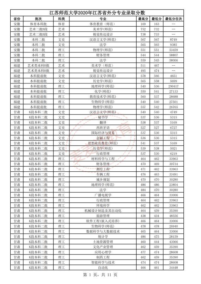 1,江苏师范大学2020在省内各批各专业录取分数及位次
