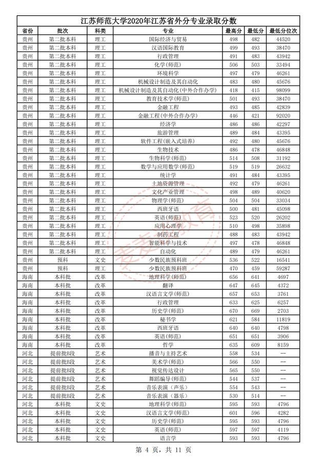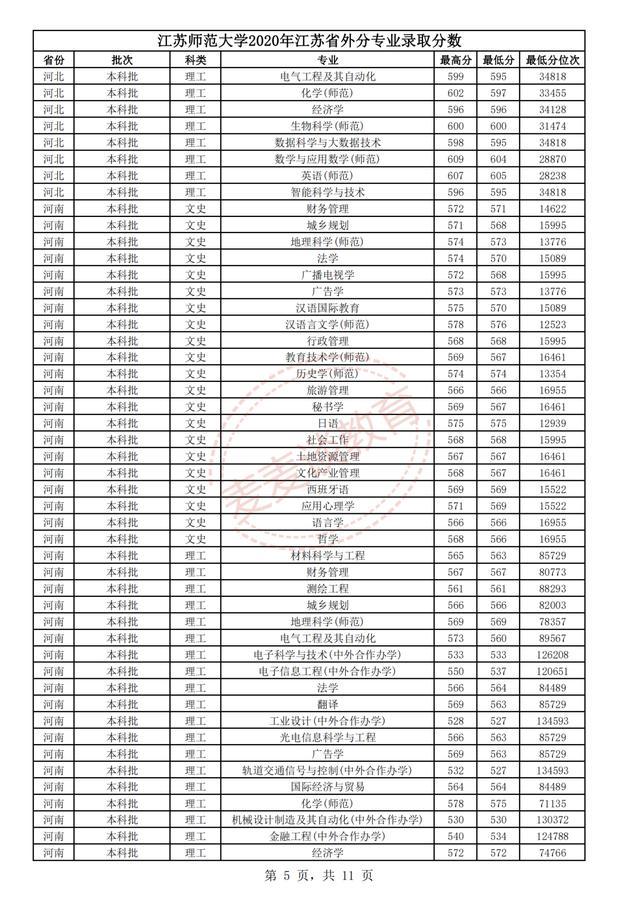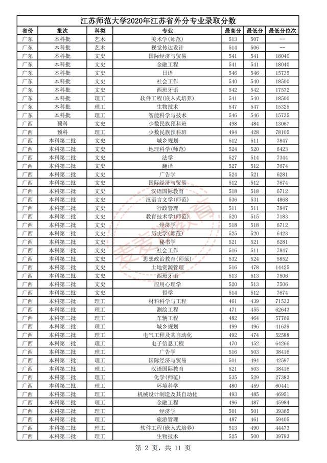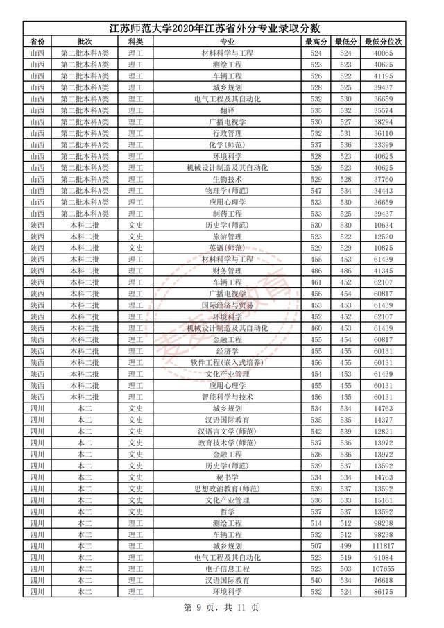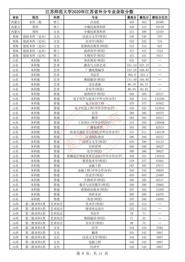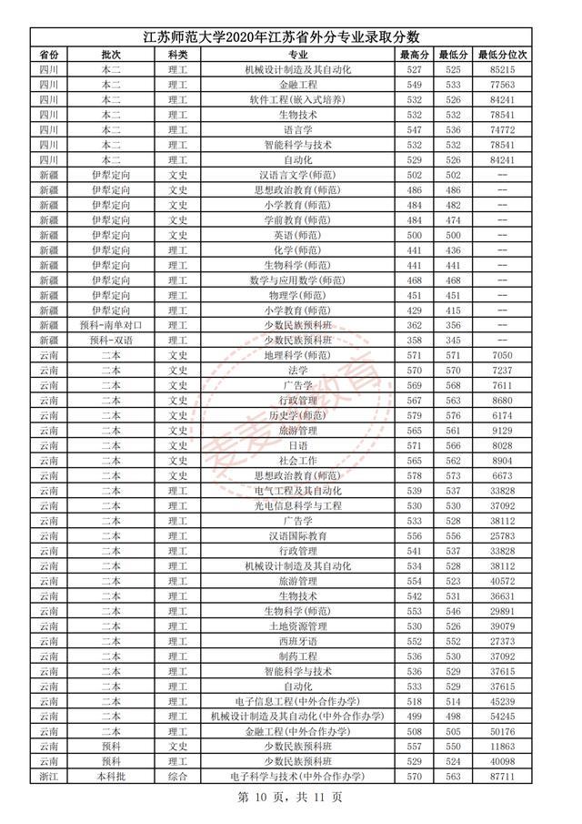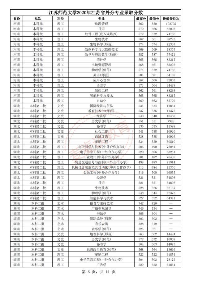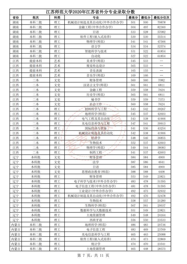 2,江苏师范大学2020在外省各省各批各专业录取分数及位次