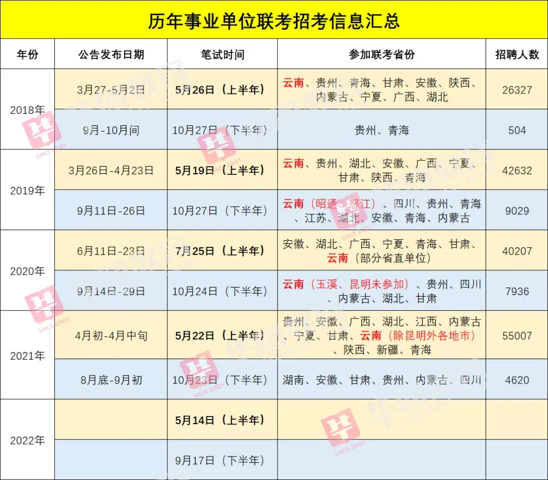 云南省从15年开始便参加上半年联考。历年的笔试时间基本都在5月下旬,今年提前一周,留给广大考生的备考时间缩短。另外根据教育部通知,很可能加快各考试阶段的进程,从公告发布-笔试-资格复审-面试,时间可能都被压缩!