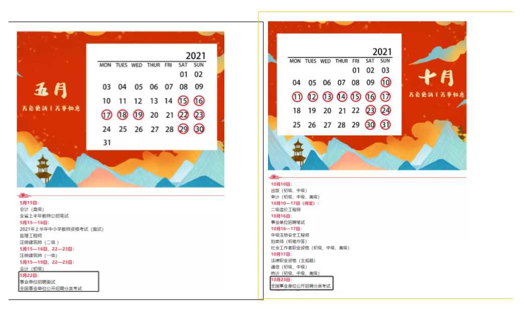 2021年2月19日发布的工作计划显示,21年上半年全国事业单位笔试时间为5月22日,下半年笔试时间为10月23日(准确)。