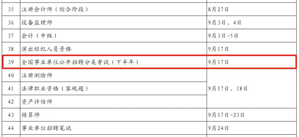 此外,工作计划中还显示,“全国事业单位公开招聘分类考试(下半年)”笔试时间为9月17日。