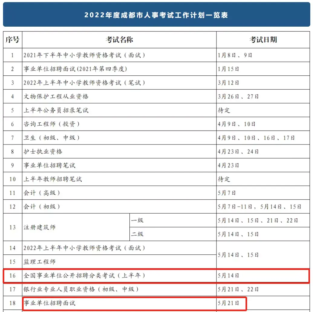 成都人社局发布的《2022年度成都市人事考试工作计划》显示,“全国事业单位公开招聘分类考试(上半年)”于5月14日进行,而原本猜测的笔试时间5月21日,显示为“事业单位招聘面试”(应为成都市事业单位单招面试)。