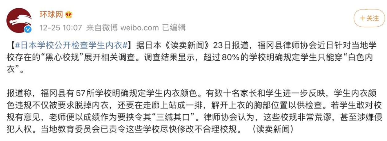 看了这则新闻 ,刷新了我的认知 ,没想到在21世纪,在日本这样的国家还有如此校规!