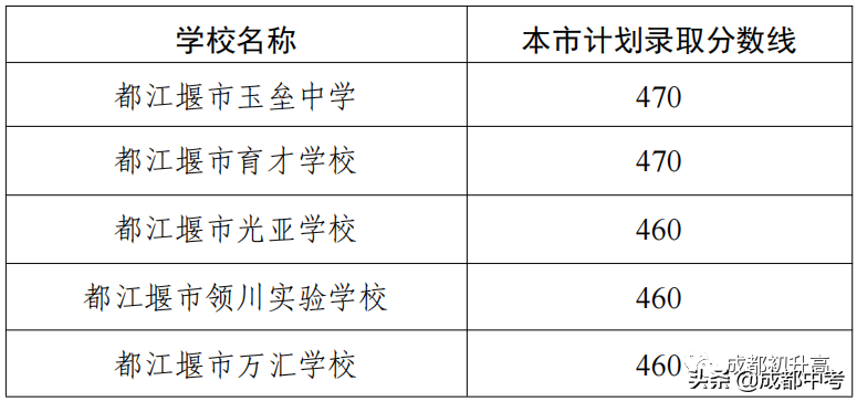 普通计划,蜀城中学:录取最低控制分数线420分;怀远中学:录取最低控制分数线400分;职教中心—蜀城中学普职融通班:指导分数线390分。