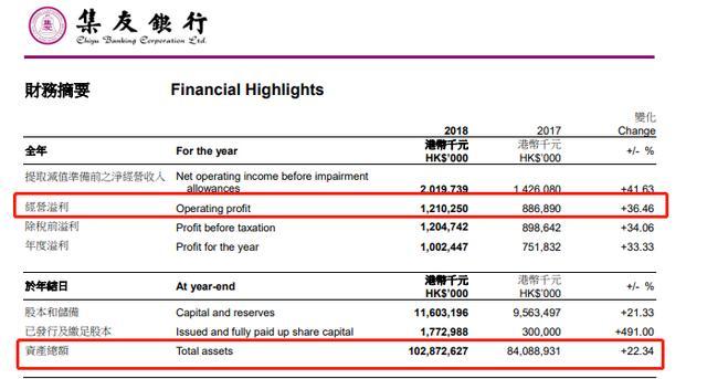 2018年资产总额为1028亿港币,约合人民币893亿元,经营利润100亿港币,资产规模增幅22.34%,利润增幅33.33%。