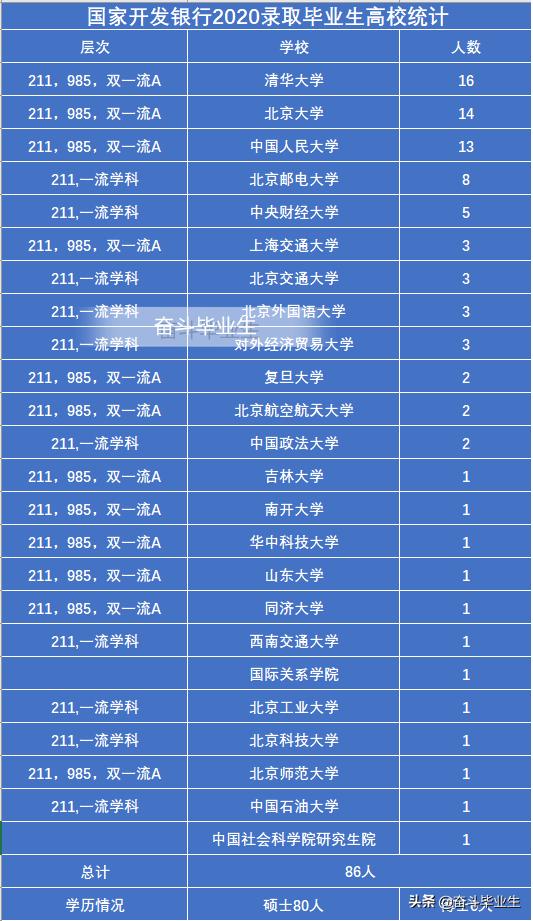 国家开发银行是中央金融企业,也是三大政策银行之一,因此每年都有很多名校学校选择国开行,毕竟福利薪资待遇都很好,谁不想去呢?国开行(含总行)2020一共录取了86名高校毕业生,所有录取的学生都是硕士研究生及以上学历,大学本科学历无一人,其中硕士研究生80人,博士研究生6人。国开行录取的学生不仅学历最低起点是硕士,而且几乎都是名校。其中我国顶级学府清华大学被录取的人数最多,达到了16人,其次也是顶级学府的北京大学有14人被录取,然后就是教育部直属重点985大学中国人民大学有13人被招录。前三名的学校都是我国第一,第二以及属于头部高校的学校,因此自然招的人数是比其他高校多的。c9高校情况如下,上海交通大学3人,复旦大学2人。在来看看财经院校,抛开学校名气来说,银行应该主要招的是以财经类院校为主的毕业生,毕竟银行各种业务都与金融,经济有关,那么招录财经高校情况就是央财有5人,对外经贸有3人。