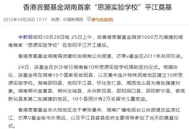 近年该机构在内地贫困地区,兴办了多所思源公益学校。而他的合作对象,正是湖南电视台旗下的公共频道以及芒果V基金。