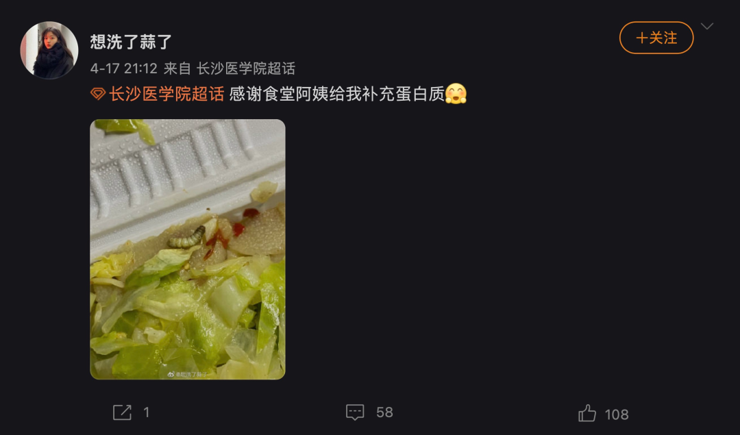 2022年4月17日,微博网友「想洗了蒜了」在#长沙医学院超话#,发布内容表示,在学校二食堂某档口,吃到生虫子,并自嘲「感谢食堂阿姨给我补充蛋白质」。