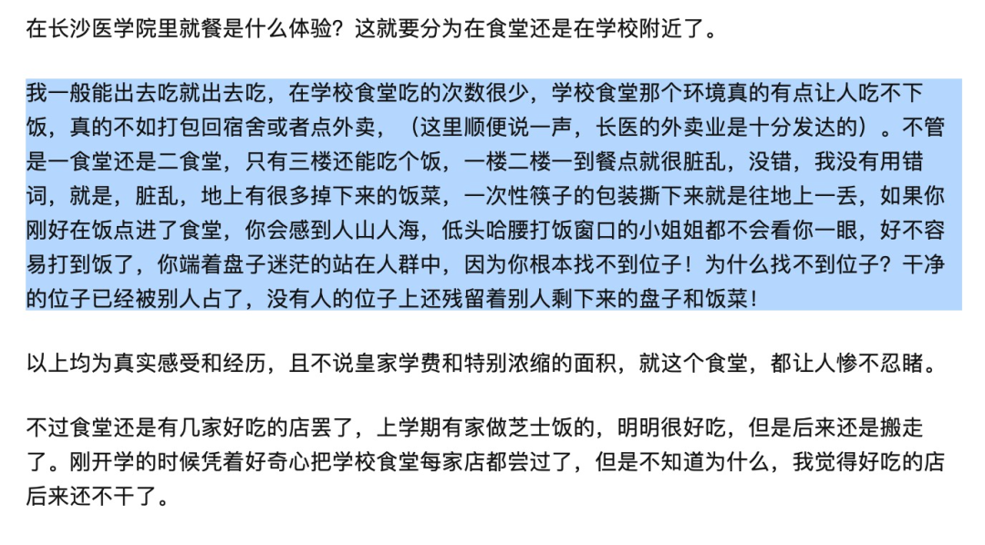 此外,作为长沙医学院大三学生,网名为「GETGET」的网友更是在知乎撰长文吐槽,不在食堂吃饭另外一个重要原因:“食堂一楼二楼一到餐点就很脏乱,而且特别拥挤,好不容易打到饭,却找不到干净的座位用餐”GETGET在知乎上写道。