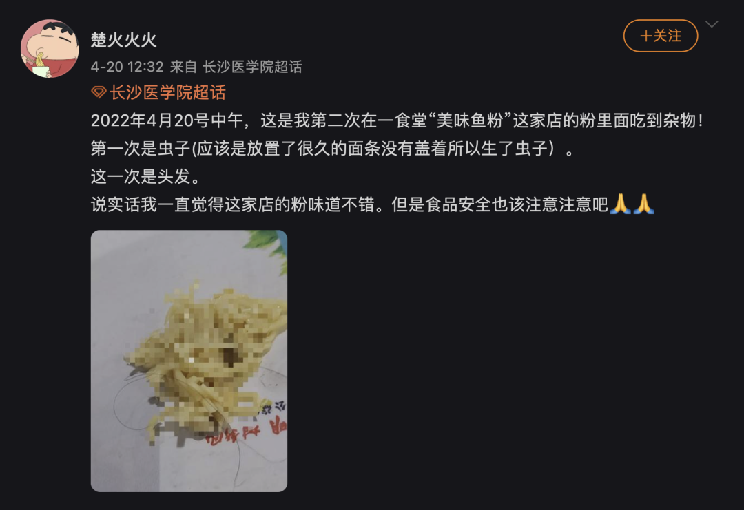 4月20日,微博网友「楚火火火」在#长沙医学院超话#,发布内容表示,在一食堂「美味鱼粉」吃到类似头发的杂物,并表示这是第二次,第一次更离谱是生虫子。