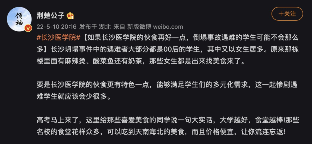 “如果长沙医学院的伙食再好一点,倒塌事故遇难的学生可能不会那么多”荆楚公子发文表示。