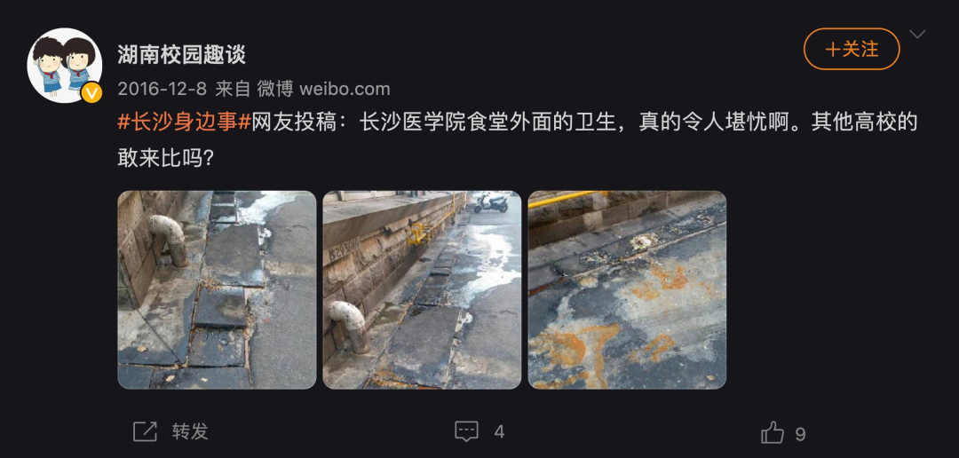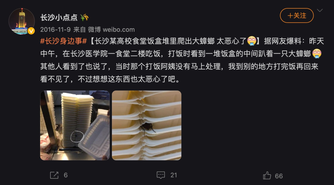 而早在2016年开始,就有匿名网友在微博爆料,长沙医学院食堂出现蟑螂、吃出异物、食堂周围污水肆意横流等问题。