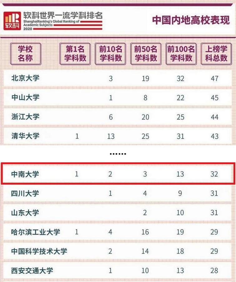 2020年6月,软科发布了"2020软科世界一流学科排名"。中南大学共有32个学科上榜,上榜数量位居全国第12位。其中,矿业工程学科排名世界第一,冶金工程学科排名世界第二。