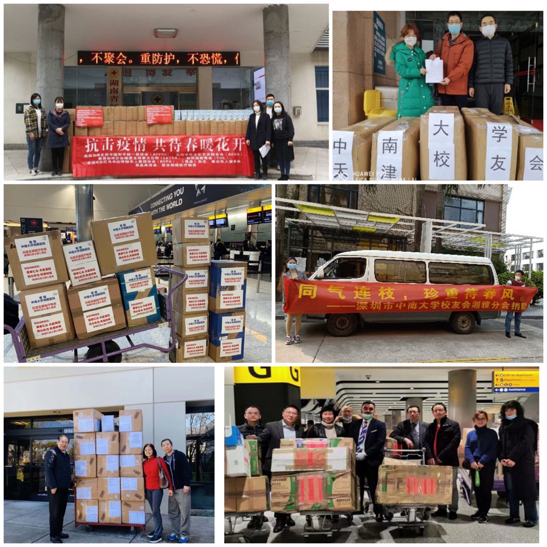 从中南大学走出的校友们,不仅大方回馈母校,也积极回馈社会。新冠肺炎疫情爆发后,分散在世界各地的中南校友们"云"集响应,踊跃行动,展开了一场场跨越山河大海的全球接力。疫情初期,深圳市中南大学校友会湘雅分会迅速行动,短短几日内就募款1360000元,364位深圳湘雅校友参与捐赠。一周内,4800个防护面罩、1182瓶洗手液、2300个外科口罩采购完毕送至武汉;大年初一,中南大学天津校友会发起爱心行动,募款109037元,把采购目标锁定在一线医护人员最紧缺的口罩、防护服、护目镜等物资上;2月初,中南校友们原本计划从迪拜采购一批口罩,经长沙中转送抵武汉,但因种种困难而宣告失败。最终经过校友们的辗转联系与多方奔走,防疫物资被送回母校的抗疫一线;3月,中南大学79级校友陈晓红院士委托英国湖南同乡会,定向中南大学湘雅医院捐赠总价值为74060元的医用物资,用于支持湖南省防疫工作。在这场战"疫"接力赛里,一位位中南校友的热情,点燃了一次次捐助行动,也照亮了防疫物资的回家路。