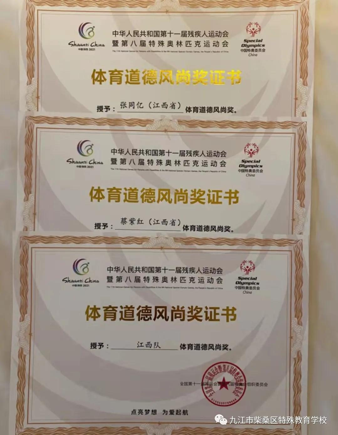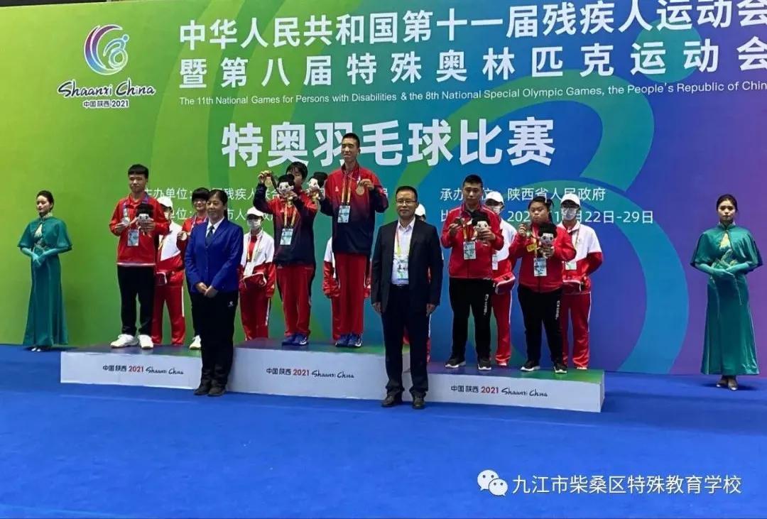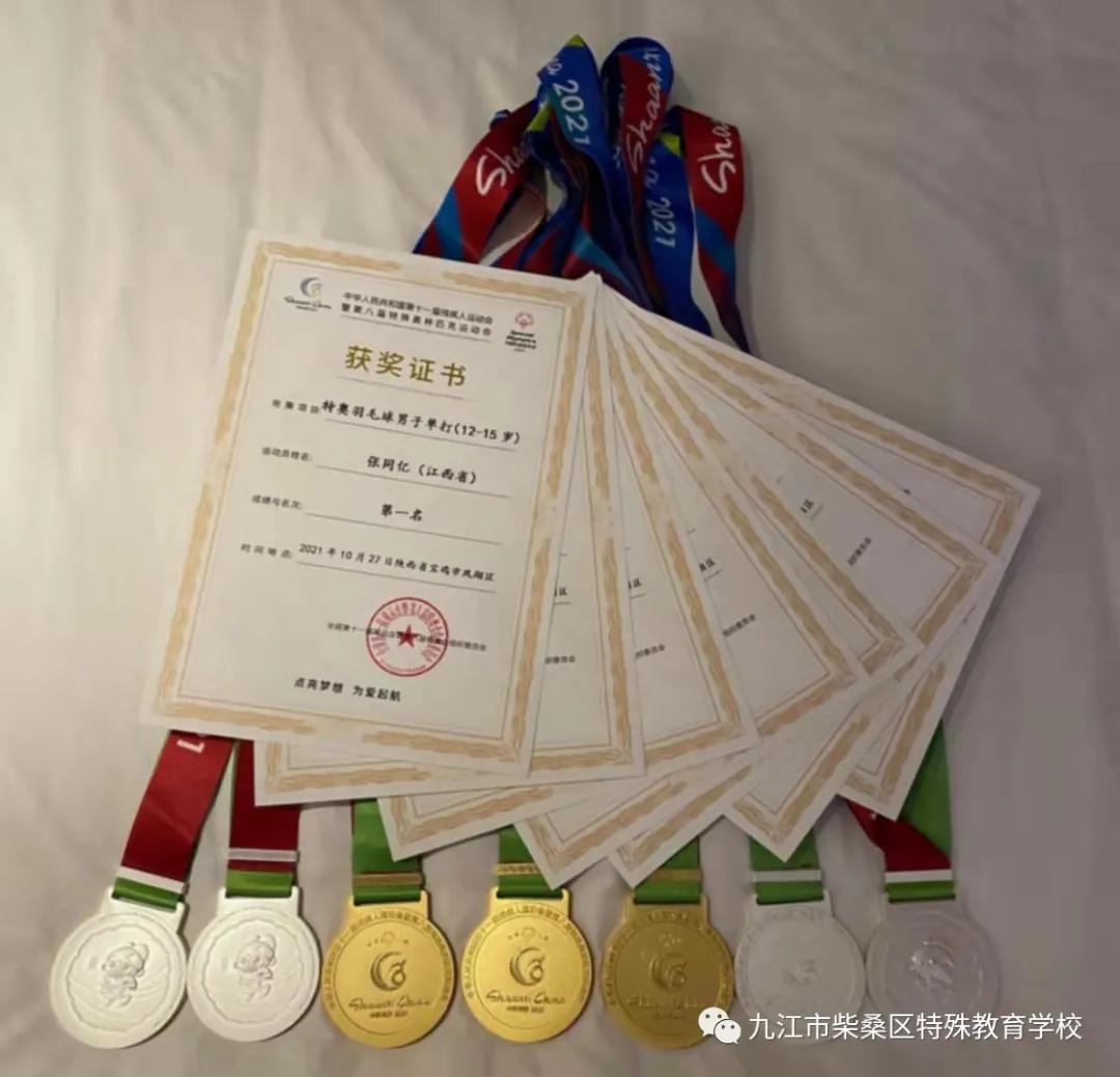 第八届特奥会共设9个大项592个小项和非体育项目“两活动一计划”,江西特奥羽毛球代表队这次派出柴桑区特殊教育学校三名队员参赛,10月30日,我校出征的3名运动健儿凯旋归来,共荣获三金四银的好成绩。