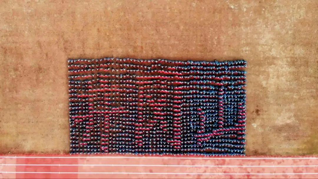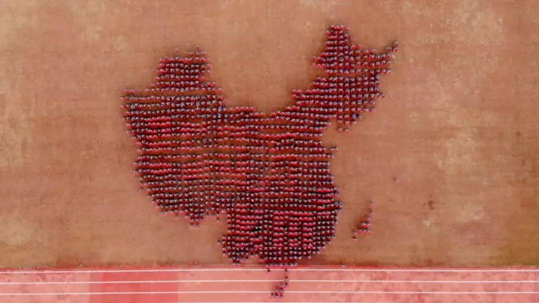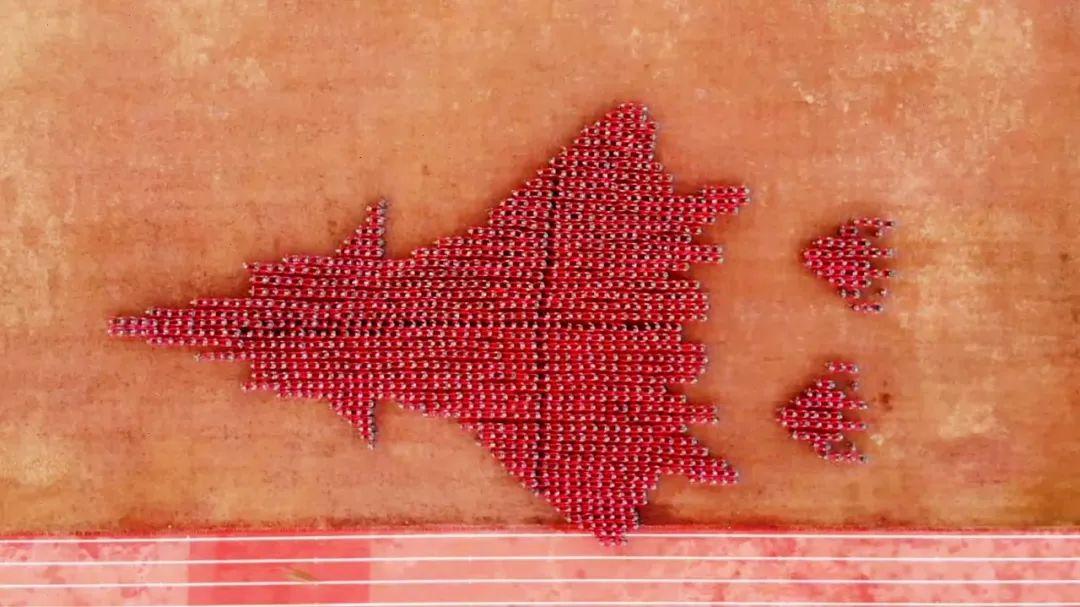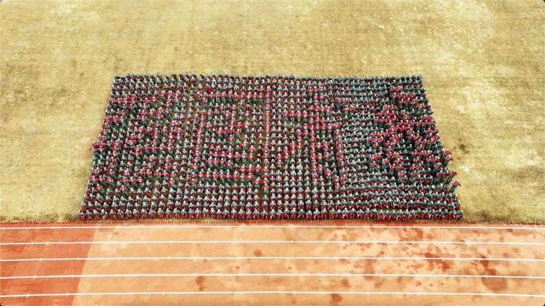 翱翔天际的战斗机从田径场“飞”过,祖国壮丽山河跃然“场”上。